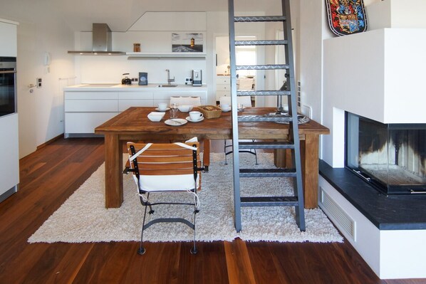 Exklusiven Wohnflair – selbst in den Ferienzeiten – gewährt diese elegante und doch gemütliche Penthouse-Wohnung im Herzen Norddeichs. Das Apartment bietet einen loftartigen, großzügig geschnittenen Wohnbereich, der Funktionalität und Luxurösität in ansprechender Weise kombiniert. Wohn- und Essbereich sind dabei bewusst komfortabel gestaltet. Die exklusive Einbauküche der Marke „Bulthaupt" rundet die repräsentative offene Gestaltung des Lofts ab. Besonders exklusiv ist der Parkettfußboden aus Walnussholz, der ebenfalls einen sehr luxuriösen Charakter besitzt. Die breite Fensterfront sorgt für den perfekten Lichteinfall. Dank der modernen Fußbodenheizung ist zu jeder Jahreszeit Behaglichkeit garantiert. Darüber hinaus verfügt das Apartment auch über einen Kamin, in dem sich bei ungemütlicher Witterung schnell ein wärmendes Feuer entzünden lässt.