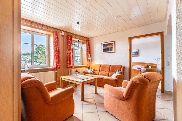 Sie ist geschmackvoll eingerichtet und aufteilt in Flur, Wohnzimmer, Einbauküche, zwei Schlafräume und Duschbad. Der Fußboden ist durchgehend gefließt. Ausstattung:Fußboden- und Zentralheizung, Sat-TV, Radio/CD-Player und Wlan. Kinderbett und Hochstuhl können gestellt werden.Die Dusche ist befahrbar mit Haltegriffen, WC erhöht. Die Einzelbetten können auf Wunsch von 39cm auf 55cm erhöht werden.