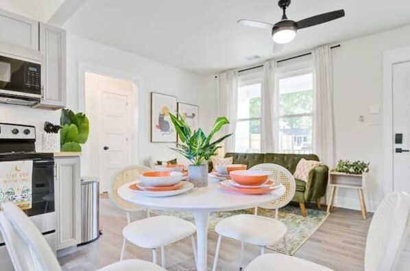 This 664 square foot two bedroom house has everything you need for a great stay.
