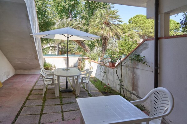 Description: ground floor with independent entrance. Recently refurbished. Living room with dining table, kitchenette and double sofa bed - double bedroom - bathroom with shower - large garden / patio equipped with table and chairs where you can eat. Free parking space (but not reserved) in the condominium courtyard.