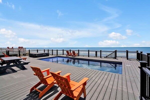 - Elevated, in-deck, private saltwater swimming pool with entertainment area. Pool Heating Available (for an additional fee).