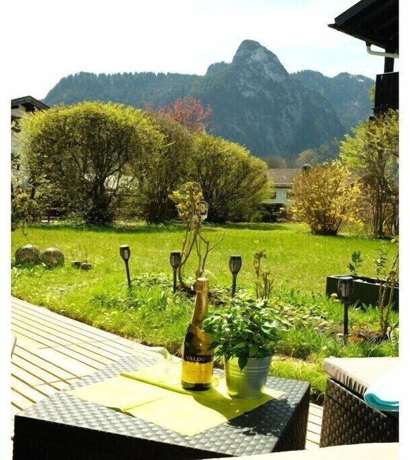 Komplett eingerichtete 2 Zimmer-Wohnung mit herrlichem Bergblick, große Westterrasse, Tiefgarage, Wohn-/Esszimmer mit direktem Zugang zur Terrasse, offene Küche mit Bar - alles stilvoll , neu eingerichtet, grosse Ausziehcouch (220 X 200 cm) mit Schlafmöglichkeit im Wohnzimmer, vollausgestattete Küche mit Geschirrspüler, Backofen und Kühl-Gefrierkombination, komplett mit Gewürzen, Öl, Balsamico etc. , Schlafzimmer mit Doppelbett und Schiebetürenschrank., 550 m ins Zentrum von Oberammergau, Waschmaschine +Trockner vorhanden