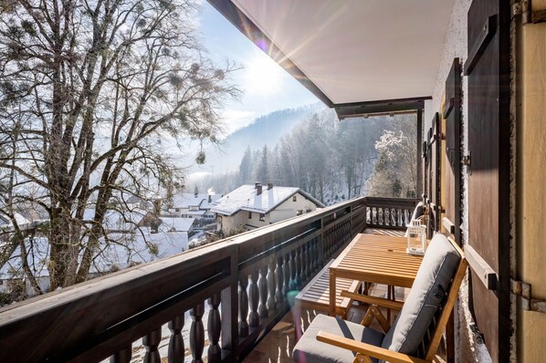 Landhaustill mit großem Eckbalkon und den Blick in die Berge ,Boxspringbetten,Spülmaschine,Mikrowelle,Sauna,