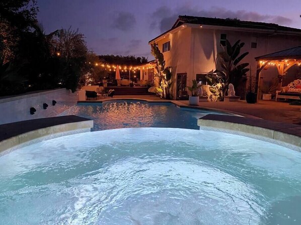• Large saltwater pool + spa (spa heat included; pool heating $100/day, $350 min)