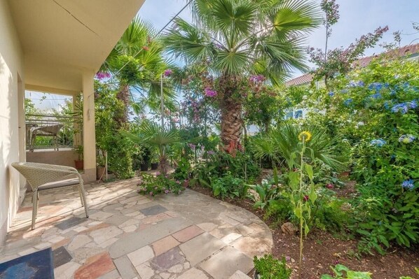 Die Wohnung bietet eine 10 m² große Terrasse mit Tisch, Stühlen und direktem Zugang zum Garten, teilweise überdacht und mit Meerblick. Eine gemeinschaftliche Waschmaschine steht beim Vermieter zur Verfügung. Parkmöglichkeiten befinden sich direkt am Objekt.