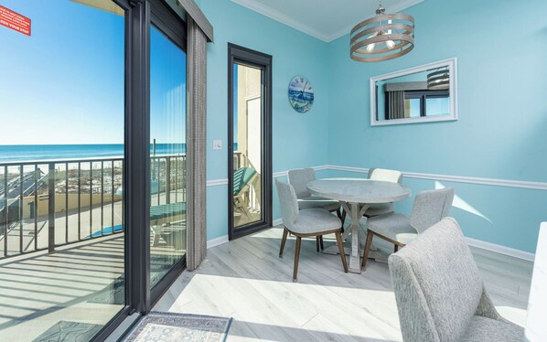 Der Meerblick von innen ist atemberaubend und der erhöhte Balkon bietet einen noch spektakuläreren Blick auf den Strand, den Golf und die Pools.