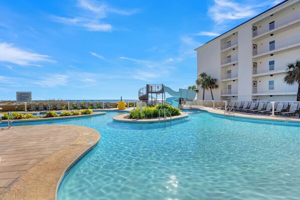 Phoenix Gulf Towers II offers an exceptional beachside experience with a mix of outdoor and indoor amenities. Step outside and enjoy direct boardwalk access to the sugar-white sands of the beach, perfect for beach lovers. The beautifully designed outdoor pool area, complete with a lazy river and water slide, provides endless fun and relaxation. The fun-filled splash pad is a hit, especially with younger guests, ensuring entertainment for the whole family. Indoors, the experience continues regardless of the weather. The heated zero-entry pool is a welcoming feature for all ages, allowing for comfortable swimming in any season. Unwind in the hot tub for a relaxing end to your day, or keep up with your fitness routine in the well-equipped fitness center.