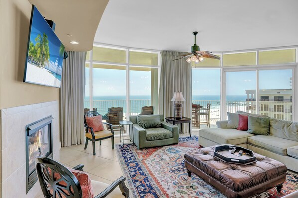 The spacious living room features a gas fireplace and a large Smart TV. The Gulf-front balcony, accessible from both the living area and the Primary bedroom, features a hot tub, a built-in gas grill, comfy loungers, an outdoor dining area, and a sink. This is the perfect place to relax and enjoy breathtaking views after a long day. There is also a north-facing balcony accessible from the third and fourth bedrooms.
