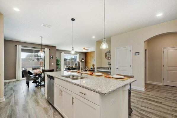 This beautiful 5-bedroom, 6-bathroom single-family home in Champions Gate accommodates up to 12 guests, offering comfort and privacy throughout. The first floor features a queen bedroom with a private bathroom, while the second floor includes a mix of king, queen, and twin bedrooms, some with private bathrooms and others sharing a well-appointed bathroom with a bathtub. With thoughtfully designed spaces and modern amenities, this home provides a perfect retreat for families or groups seeking a relaxing and luxurious stay.