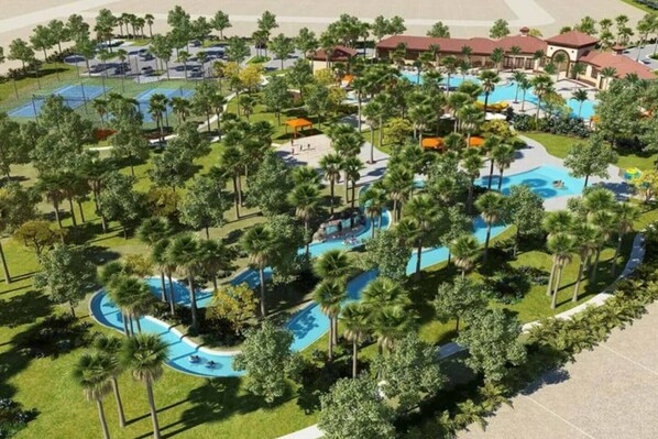 • Heated resort pool, lazy river, and water slide