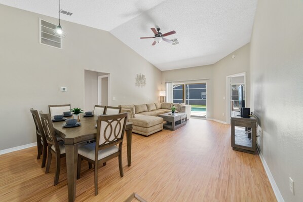 Entering the home will bring you into the Dining & Living area, featuring tasteful décor and comfortable seating for 6. Check out the 55" 4K Smart Fire TV on the huge sectional sofa! Easy access to the Lanai & Pool through the sliding glass doors.