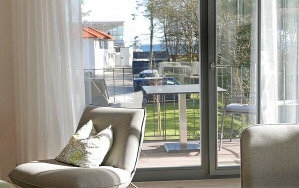 Die bodentiefen Fenster im Wohnbereich bieten einen Blick bis zum Meer. Auf dem Balkon befinden sich Stühle und Tische, auf denen Sie den Blick aufs Meer genießen können.