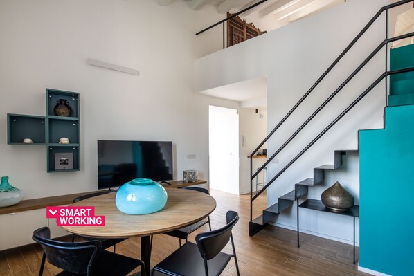 The apartment is located on the third floor of a recently renovated building with an elevator. The house, which spreads over two levels, boasts furnishing elements of Arab tradition mixed with modern and design furniture, creating a unique style. The first level features the living area, furnished with a sofa, a dining table, a television, and a fully-equipped open kitchen. The sleeping area is distributed over the two floors; the first bedroom houses a French bed, the second bedroom, accessible by taking a staircase in the living room, is located in the loft that houses a queen-size bed, a closet, a desk and an ensuite bathroom with shower. An additional bathroom with shower completes the layout.
