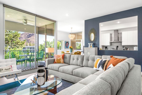 The second bedroom is no less spectacular, with its bright aqua mid-century wallpaper and other decor touches, plus king bed with luxurious mattress. The room also provides a dresser plus wall-mounted TV, and is located right next to the central bathroom which has to be one of the most incredibly fun restrooms you will ever see. Its desert-inspired pink and green wallpaper is the perfect contrast to its super slick finishes, from its vanity to the the mosaic tile surrounding the shower and bath.