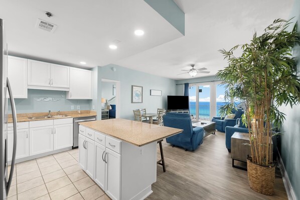 Stylish Interiors: Tastefully decorated in calming blue tones, the condo exudes a serene, coastal vibe.