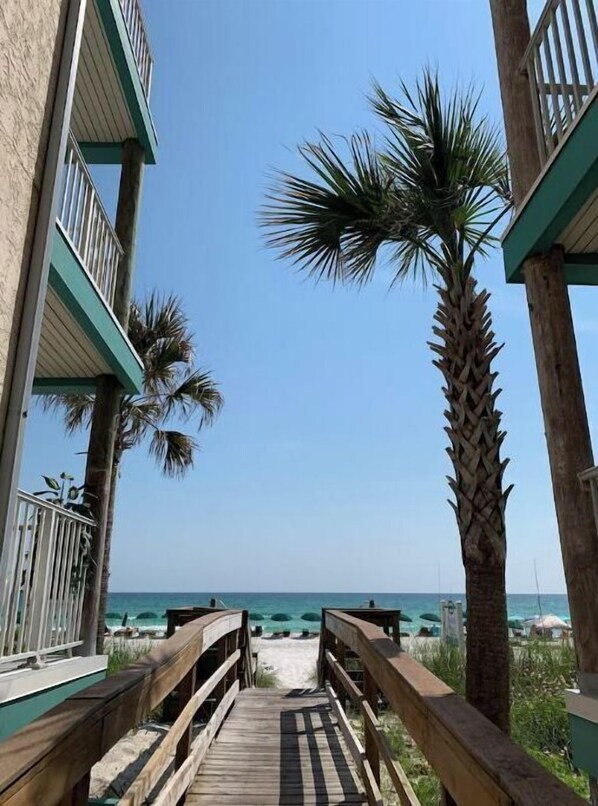 BEACHSIDE and pool view. NOT BEACHFRONT. Only steps to the beach! No chores upon departure, no resort fees. JUST FUN. 1 bedroom condo is a bottom floor unit. Direct walk out access to the pool and only a few steps in your flip flops to the beach. The master bedroom has a king size bed, TV & ceiling fan. The living room has a sleeper sofa and 2 recliners for your comfort. The perfect condo for a family of 5. There are grills by the pool.