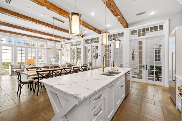 Guests enter into an open living, dining, and kitchen area with exposed timber ceiling beams, a tile floor, and a refined coastal aesthetic. A white and bright gourmet kitchen has premium appliances, a Thermador 4-burner gas range with a griddle, and gorgeous Calcutta marble countertops that lead to an adjacent butler’s pantry with additional storage. Windows and French doors wrap around the living and dining area, filling the space with natural light. A bedroom is tucked off the living area. Guests can recline on a wraparound sofa and watch TV, and enjoy music on the SONOS sound system. Guests will love this private oasis! They can relax in the shade of a covered porch or step down to a landscaped courtyard. A stone walkway connects a dining area to a luxurious outdoor kitchen with a marble counter, a gas grill, 2 gas cooktops, and a stand-alone ice maker.