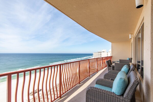 The spacious fully equipped & stocked kitchen with stainless steel appliances will make you feel right at home cooking your favorite meals while watching the beautiful gulf views. The large formal dinning table can seat 8 people and 4 more bar stools will provide more seatings. For casual meal or morning coffee, the spacious balcony large glass-top table and enough additional comfy seatings will provide the stage for you to enjoy your meals while watching the amazing ocean views and listening the waves crash against the white sand.