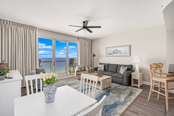 Relax with the whole family at this peaceful and beautifully appointed beachfront condo, perfectly situated on the 17th floor of Calypso Resort Tower 2. Step out on to your private balcony and take in breathtaking, panoramic views of the Gulf - where sunsets meet serenity. This spacious 1 bedroom, 2 bath condo with built-in bunks comfortably sleeps up to 6 and offers all the comforts of home with the added luxury of resort-style amenities. Walking distance to Pier Park with food, shopping, Dave & Busters, sky wheel. Top Golf .6 miles. Target/Walmart .8 miles. Pirates Voyage and dinner show 1.3 miles. Frank Brown park 1.8 miles. This location puts you in the center of it all!!!