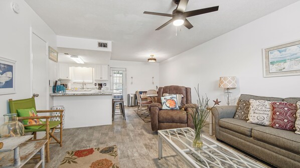 The Condo was in a great spot, & was well equipped. Consider renting a gulf cart for trips to the beach.unless you can pack really light, it's a good haul carrying a cooler, & all the stuff for a family of 4. The good work around for us was that I just drove the kids & Stuff to the beach access. Dropped them off...went back to park in our spot at the Condo & then did the quick 7min walk empty handed on my own...) That worked out fine... Other than figuring that one little issue out, the stay was really wonderful!