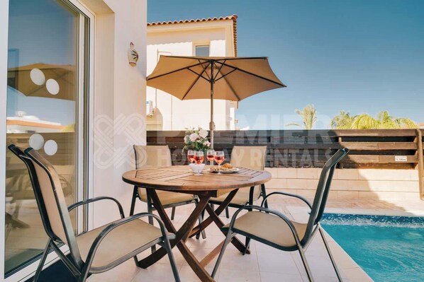 The outdoor space is a haven for relaxation, offering the best of Cyprus's splendid weather. Bask in the sunshine on sunbeds, take a refreshing dip in the inviting pool, or savour al fresco dining under the starry skies. Villa Karisa promises an exceptional stay, no matter how you choose to indulge in the blissful surroundings.