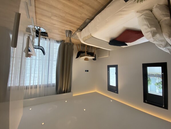 Our “Mini Studio” B8 (17 sqm) is on first floor, accessible via a large staircase (no elevator), our “Mini Studio” C8 & C9 (18 sqm) are on ground floor on the courtyard. They are all fully equipped, with a Twin size bed . They all have a bathroom with a spacious rain shower. All apartments are designed with a smart lighting system that gives you control of a general switch (on/off and scenarios) of the lights from the entrance and from the bedside.