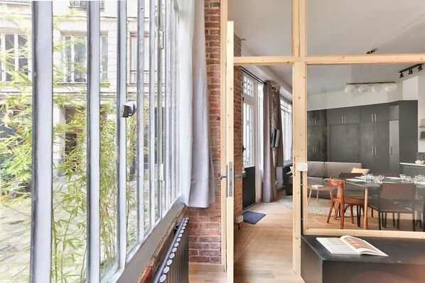 Welcome to a character building, located in a cobbled and green courtyard, very quiet. It has a superb patio door and over 3 meters high ceiling!