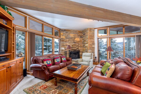 Wohnzimmer: High Balkendecke, Boden bis zur Decke Kamin (Holzofen mit Gas zu unterstützen), 50 "HDTV mit HD-Service, Blu-Ray DVD, CD, Surround-Sound-Stereoanlage, reichlich Sitzgelegenheiten. Große Aussicht auf die Berge von den zwei Glas-Schiebetüren und zwei Decks. Königin Schlafsofa in diesem Raum.