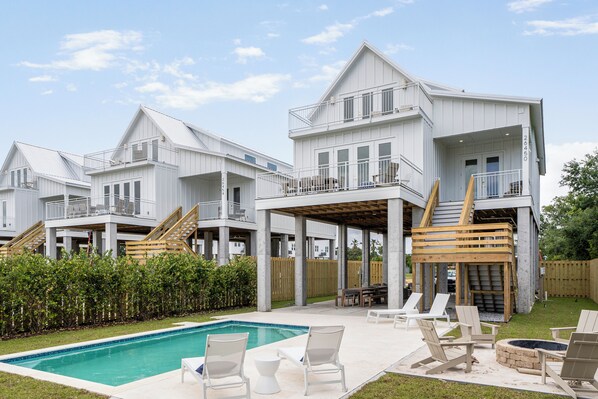 Start your stay beneath the home’s elevated frame, where a thoughtfully designed covered hangout area awaits. Here, you’ll find a comfortable outdoor living room, shaded dining for 14, poolside loungers, and a private heated swimming pool—perfect for lounging after beach walks or coastal adventures. Best of all, you’ll enjoy direct access to the beach just beyond the pool deck.