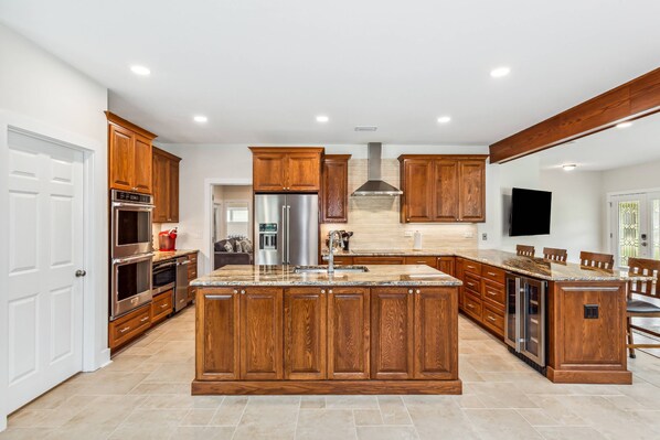 The first thing you'll notice when you walk in is the gorgeous brand new kitchen. The fully renovated kitchen is truly the center of the home as it opens up to the main living room and dining area. It is fully equipped with all of the amenities of home and then some. There are brand new cabinets with granite counters. High end stainless steel appliances have been added including an ice maker and wine fridge! There is also a double oven, under counter lighting, coffee bar, huge island, and bar seating for 4. Just off the kitchen is a huge laundry room with more cabinet storage and a full size washer and dryer.
