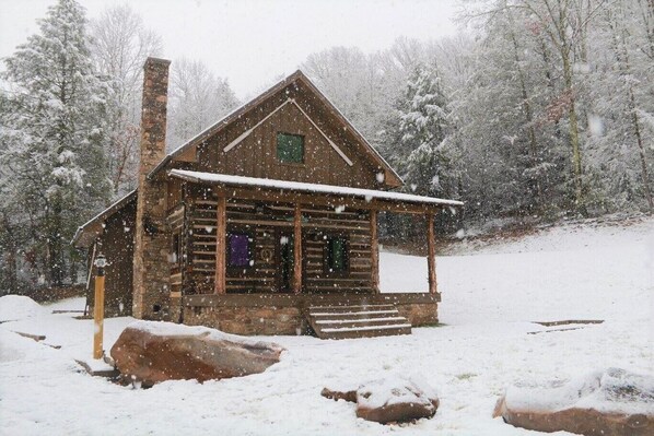 Master bedroom downstairs with a comfortable queen sized bed, open loft (accessed by a wide ladder) with 3 queen comfortable beds, 2 full bathrooms with heated floors (stocked with towels, washcloths, and toiletpaper), a full sized kitchen stocked with basic cooking amenities (dishware, glasses, silverware, cooking ware, toaster, microwave, and a Keurig with a handful of K-Cups). Our dining table has seating for up to 6 people. This cabin features a wood burning fireplace to keep you warm during our winter months (firewood not included but available for purchase). A TV with a DVD and BlueRay player only are included in the cabin.