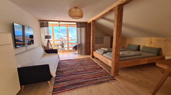 Dachstudio im sanierten historischen Hof Hauswang. Wohnung mit viel Bergblick bis zur Zugspitze. Gemütliche Dachstube im alten Gebälk, gemütliche Sessel, eigene Küche - und die Möglichkeit viele Gemeinschaftsbereiche im Gästehaus mitzunutzen. Du hast ein geräumiges eigenes Dusch-Bad, Deine eigene Küche - aber auch Zugang zur großen Gemeinschaftsküche. Es gibt ein Doppelbett 2 x 1,8m sowie ein Schlafsofa 1,9 x 1m, einen Schreibtisch, zwei Sessel und Giebelverglasung mit schmalem Balkon.