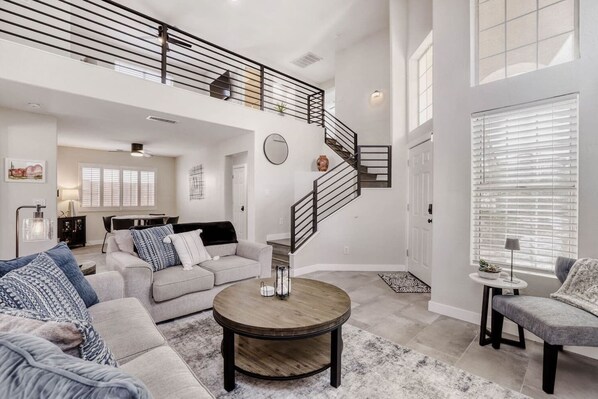 Designed for comfort and ease, the home spans two stories with an open, airy layout and modern finishes throughout. The interior was fully remodeled in 2021 and features clean lines, updated fixtures, and a warm, contemporary feel. The main living area invites you to settle in with plush seating and a large flat-screen TV ready for streaming. Natural light flows easily through the space, creating a calm atmosphere whether you’re gathering with family or enjoying a quiet afternoon indoors.