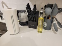 We rented a studio for only 1 night and were pleasantly surprised by the amenities -- it was like a fully furnished apartment. The design was modern and clean, and bathroom was spacious. The AC worked well and was very strong. Unlike other rentals that have limited appliances, our room had a full size fridge and freezer, microwave, oven with stovetop, dishwasher, washer and dryer, coffeemaker and kettle. There was a water filter pitcher in the fridge, cooking utensils, cutting boards, a big can of coffee grounds, dishes and cutlery, ironing board and iron. The check-in and checkout process were tricky, as was the free parking, which was in another complex across the street. Ideally, if you can check-in while the front office has staff (we did; staff were very helpful), it was a bit easier. It is not convenient if you have multiple loads to transport to and from your car, but with planning, it was fine. Questions were answered quickly by email, and you get multiple email and text notifications on how to obey the rules and avoid surcharges. Now that I know the system, and because we like to prep our own food, I'd like to stay for longer.