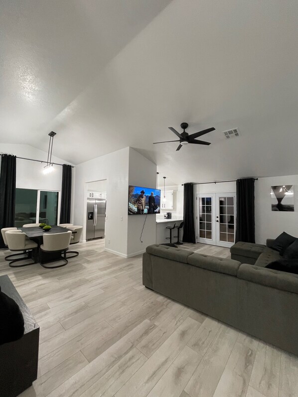 The home features a very modern and minimalistic design allowing for the open space of the house to really bring the people together. The family room, informal dining room, and spacious island kitchen are open to the family room making it perfect for entertainment. The master bedroom comes with a large walk-in closet and full bathroom, the room is accompanied by a major 80’ inch flat screen T.V. and king size bed. The additional bedrooms are both similar, having a queen bed and 65-in. T.V. accompanying them. Stay connected with the smart TV's throughout the house with service provided by Netflix and WiFi throughout the house.