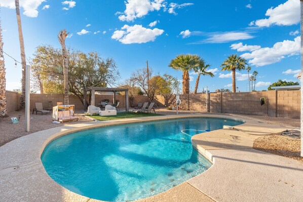 Privacy surrounds the sparking blue heated pool and freshly remodeled home. Pets stay for free! Great location just 20 minutes to airport and minutes to dining, shopping and easy freeway access. Spacious great room, and fully equipped kitchen with everything you need, or step out and grill up your favorites! Complimentary heated pool set to 85 degrees in winter and fast WiFi. Come relax and enjoy this lovely home for the perfect getaway! We support equality!