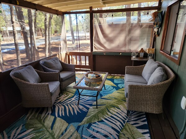 Located in Pinetop-Lakeside, this delightful property features a 1-bedroom main house of 420sqft with added porch of 350sqft. and, with a detached nice size casita, making it the perfect retreat for guests. The main house offers a cozy queen bed, while the casita includes a twin bed and a full bed, ensuring a comfortable stay. Enjoy the convenience of amenities like WiFi, BBQ, a washing machine, and a dryer.
