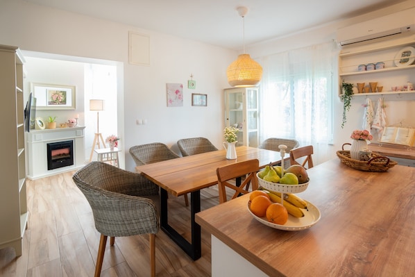 This comfort apartment can accommodate up to five people. It features free WiFi, air-conditioning and LCD satellite TV. Kitchen is well equipped. Living room comes with two armchairs and dining room comes with table with 5 chairs and two bar stools. Private bathroom includes shower and hair dryer. On the terrace there is a table with chairs.