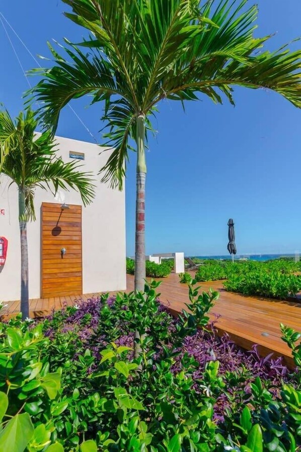Gehen Sie auf das gemeinsame Dach, auf dem Sie wahrscheinlich die meiste Zeit Ihres Urlaubs verbringen werden. Die Dachterrasse bietet einen atemberaubenden Blick auf das kristallklare türkisfarbene Wasser der Karibik, das nur wenige hundert Meter entfernt ist. Der große Infinity-Pool und mehrere Sitzbereiche sind der perfekte Ort, um ruhige Tage und entspannte Nachmittage im Sonnenschein zu genießen.