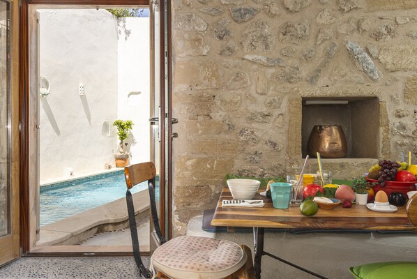 Das Haus ist mit Steinwänden gebaut, um das Innere in den heißen Sommermonaten kühl zu halten, und es gibt eine Zentralheizung für gemütliche Räume im Winter.