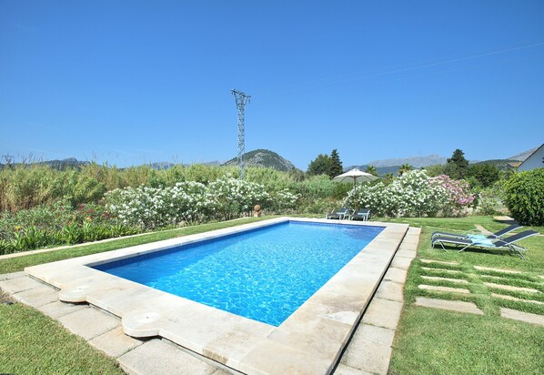 Im Außenbereich lädt der private Bereich dazu ein, das mallorquinische Klima zu genießen: mit Pool, Sonnenbereich und freien Ausblicken auf Berge und sanfte Hügel. Es gibt eine überdachte Terrasse und Plätze zum Essen im Freien sowie einen Grill und eine Außenküche mit Holzofen und Spülbecken – ideal für lange Mahlzeiten in guter Gesellschaft. Eine Tischtennisplatte sorgt zusätzlich für Abwechslung.