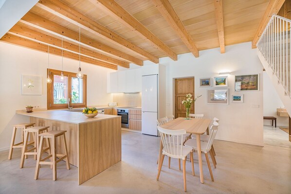 La casa ha sido reformada y terminada en junio de 2022 con materiales de alta calidad y respetando la nueva normativa ambiental energética.El interior es espacioso y luminoso, con muebles modernos. Todas las habitaciones están a nivel del suelo (tenga en cuenta que arriba hay un almacenamiento cerrado y no accesible). En el salón-comedor hay una cómoda zona de estar con Smart TV, Aire Acondicionado Frío y calor para agradables veladas en las vacaciones de otoño o primavera o los días más calurosos del verano. La cocina moderna tiene electrodomésticos que incluyen un lavavajillas, un horno. También hay un lavadero con lavadora.Hay tres bonitos dormitorios, dos dormitorios dobles con cama de matrimonio, uno de ellos con baño en suite y otro dormitorio con dos camas individuales. Hay otro baño completo con ducha.Esta es una opción perfecta para familias que quieren su propia villa privada y piscina, pero también tienen cerca la hermosa bahía de Cala Molins, ¿por qué no tenerlo todo?