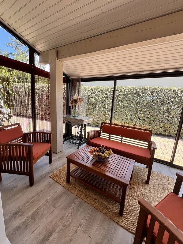 -Geräumiges, klimatisiertes Wohnzimmer mit Kamin.
