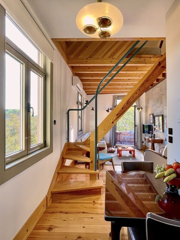 We spent five nights in the Art Nouveau rooftop duplex and enjoyed it and Porto immensely! The place was immaculate and extras were really appreciated - fresh fruit, port wine, candies and cookies. What's not to like about cookies! Manuela was a gracious host and walked us through sights to see, restaurants and the neighbourhood in detail. Comfy bed but watch not to bump your head on the sloped ceiling!