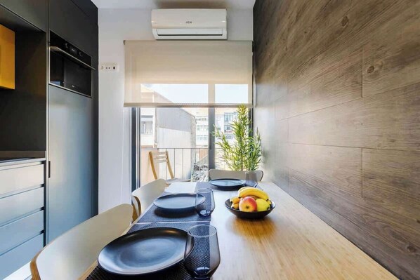 Inside each home, slate-grey cabinets and sunshine-yellow panels echo Porto’s famous tiles. The open kitchen is equipped with ceramic hob, oven, fridge, toaster and espresso machine for leisurely breakfasts. A spacious sofa-bed in the lounge converts to nighttime comfort, while sliding glass doors reveal a petit balcony for coffee or wine. Down the hall a calm double bedroom awaits, and the azulejo-lined shower room adds Portuguese flair. AC, smart TV and a ground-floor laundry room ensure an easy stay.