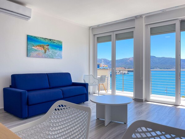 Ferienwohnung 4/6 Personen: die Immobilie, die unseren Gästen zur Verfügung steht, ist circa 75 Quadratmeter groß und befindet sich in einem erst kürzlich renovierten Gebäude mit mehreren Wohnungen auf mehreren Stockwerken, ganz in der Nähe vom Hafen und einigen der bekanntesten Strände von Portoferraio, nämlich Le Ghiaie, La Padulella und Capobianco. Die Wohnung “Fronte Mare” befindet sich im dritten Stock, in den man über eine Treppe oder auch mit dem Fahrstuhl gelangt, und besteht aus einem großzügigen und bequemen Wohnraum mit einer gut ausgestatteten Kochnische (mit Induktionsherd, Kühlschrank mit kleinem Gefrierfach, Ofen, Spülmaschine) mit und einem bequemen Doppelschlafcouch und TV, einem bequemen Schlafraum mit Doppelbett, ein Schlafraum mit Einzelbett mit ausziehbarem Bett, ein Bad mit Dusche und Waschmaschine. Außerdem ein groß, bequem Balkon mit Meerblick, ausgestattet mit Tisch und Stühlen. Die Wohnung ist neu und mit schönen Details renoviert, die Einrichtung ist komplett neu und modern. Ausstattung: Heizung und Klimaanlage, öffentlicher, nicht überdachter Parkplatz in der Nähe.