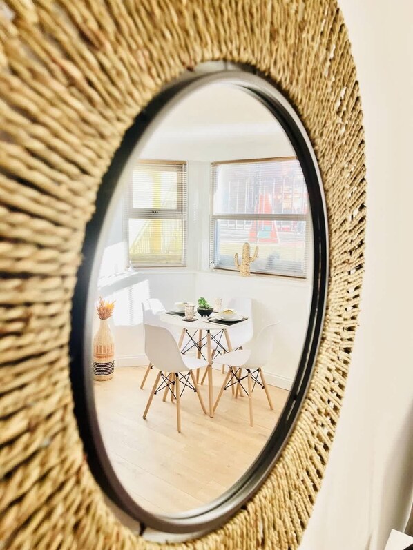 Dining areas include either a dining table and chairs located by the front bay window or a breakfast bar with bar stools in the kitchen area. The dining table is perfect for a romantic meal, while the breakfast bar is ideal for a quick bite before heading out to explore the city and seafront, or for feeding family and friends.