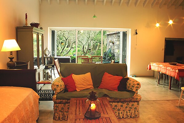 "Casa das 2 Marias" ist ein traditionelles azorisches Haus im Zentrum von Furnas, das in Bezug auf seine charakteristischen Elemente wie Wände aus Vulkangestein, Mansarde, Holzofen und Schornstein vollständig restauriert wurde. Errichtet auf einem Konzept des offenen Raumes und der Weinlesedekoration, bietet es die besten Freizeit- und entspannenden Momente in Kontakt mit Natur an. Wenn Sie das Haus betreten, gelangen Sie in die Lobby: ein großes Wohnzimmer (mit Kabel-TV und kostenfreiem WLAN), das mit einer geräumigen und voll ausgestatteten Küche (Herd, Backofen, Mikrowelle, Wasserkocher, Toaster, Mixer, Kaffeemaschine, Kühlschrank) verbunden ist , Waschmaschine) und mit Holzofen, beide mit Blick auf die Terrasse und den Garten; ein komplettes Badezimmer mit Dusche; und die Treppe im Zwischengeschoss, wo Sie das Hauptschlafzimmer finden. Sie können in einem der vier Betten übernachten: ein Doppel (140x200 cm) und ein Doppelbett (90x200 cm) im Zwischengeschoss und zwei Einzelbetten (90x200 cm), die im Wohnzimmer zur Verfügung stehen. Draußen können Sie die Terrasse mit bequemen Möbeln, Liegestühlen und einem kleinen Grill, die Dusche mit Quellwasser, und den Garten mit Obstbäumen und kleinen Gemüsegarten genießen, wo Sie das verzauberte Tal von Furnas und das Flussufer genießen können das Ende vom Garten Wenn Sie Glück haben, werden Sie die Gesellschaft von lokalen freundlichen Katzen genießen, die wir "die Wächter" nennen!