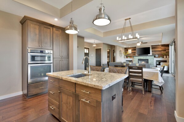 Kitchen: The home has a fully stocked kitchen, complete with a double oven, gas range, microwave, dishwasher, toaster, and coffee maker! It has plenty of pots/pans, BBQ utensils, and stocked with your basic spices and oils.