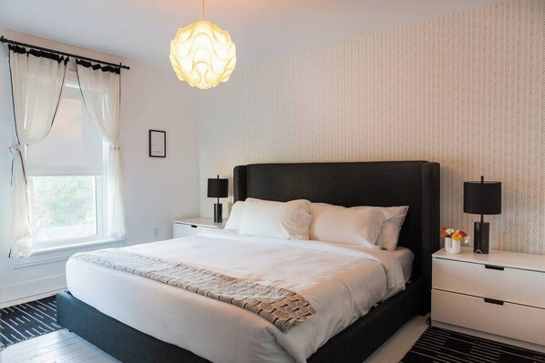 Elegant Bedrooms: This home boasts three beautifully decorated bedrooms, each with comfortable beds and stylish furnishings. The primary suite includes a king-sized bed.